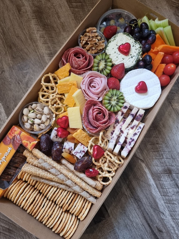 Antipasto grazing box with all deli favourites: cold cut meat, dips, cheese, crackers, breadaticks, marinated vegetables, fresh veggie sticks, pretzels, fresh and dried fruit.