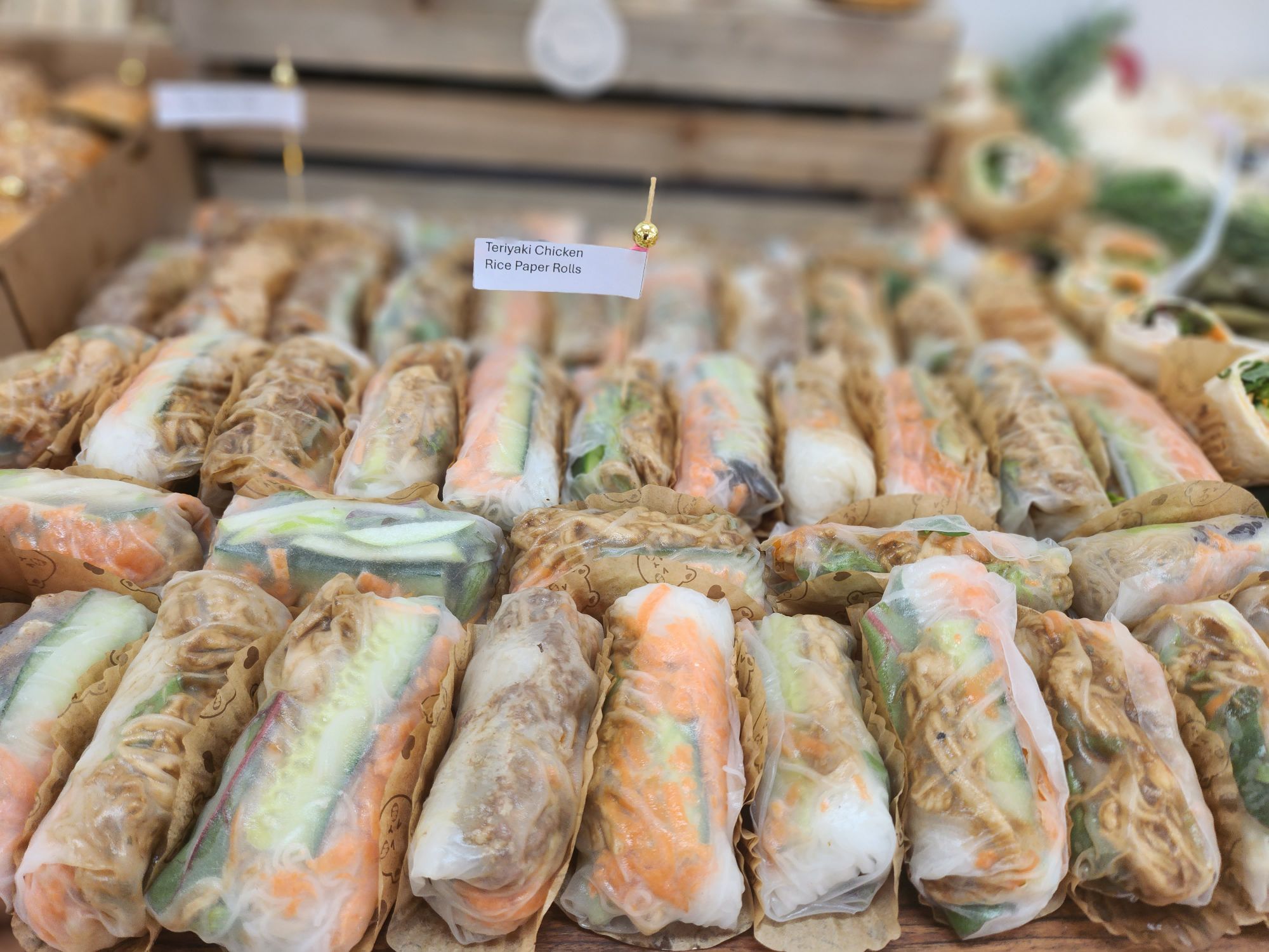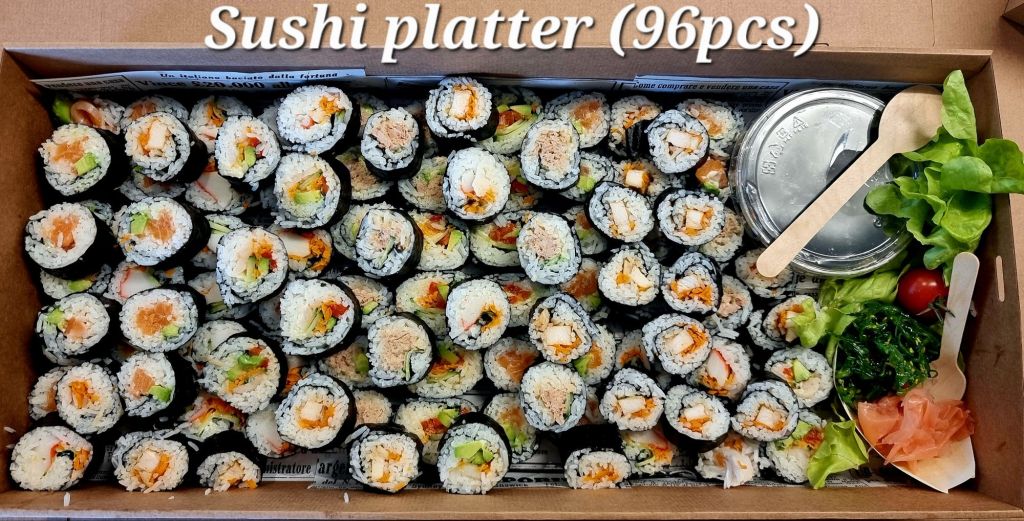 20 party size rice paper rolls with salad fillings and variety flavors ( Teriyaki chicken, Lemongrass beef, Avocado, Prawn, Salmon, Tuna, Eggs etc), come with dipping sauce