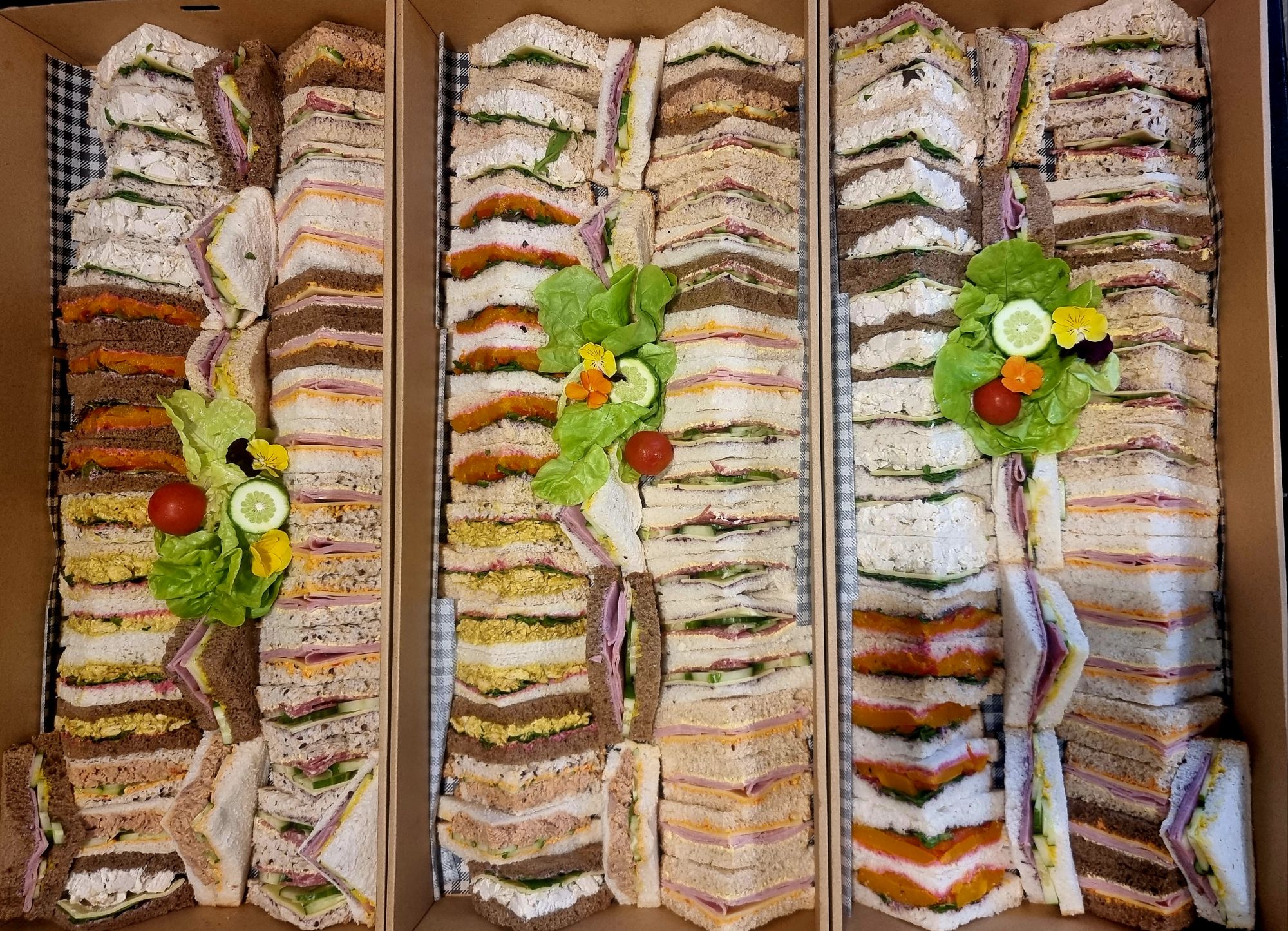 Sandwich fillings might include: Smoked salmon, cream cheese, sundried tomatoes. Turkey cranberry sauce and avocado. Chicken avocado. Ham and cheese. Roast beef and salad. BLT (bacon, lettuce, tomatoes). Curried eggs lettuce. Roasted pumpkin, spinach, feta (V). Cheese, avocado and salad (V)