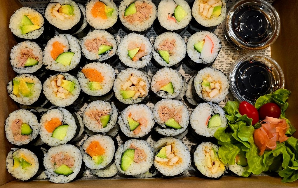 Maki cut sushi rolls. Fillings might include: √ Salmon √ Tuna √ Chicken √ Prawns √ Avocado cucumber √ California. Come with dipping sauc